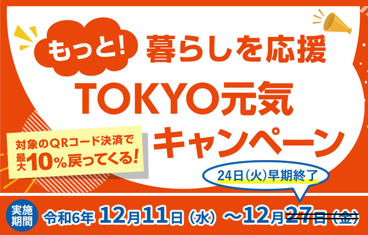 当店は「TOKYO元気キャンペーン」対象店舗です。4つの決済すべてご利用可能です。